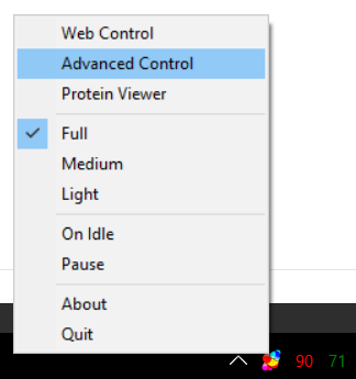Вы всегда можете открыть веб-панель управления по тому же адресу client.foldingathome.org или воспользоваться продвинутой панелью управления если выберете пункт “Advanced control” в меню у иконки Folding@Home в трее: