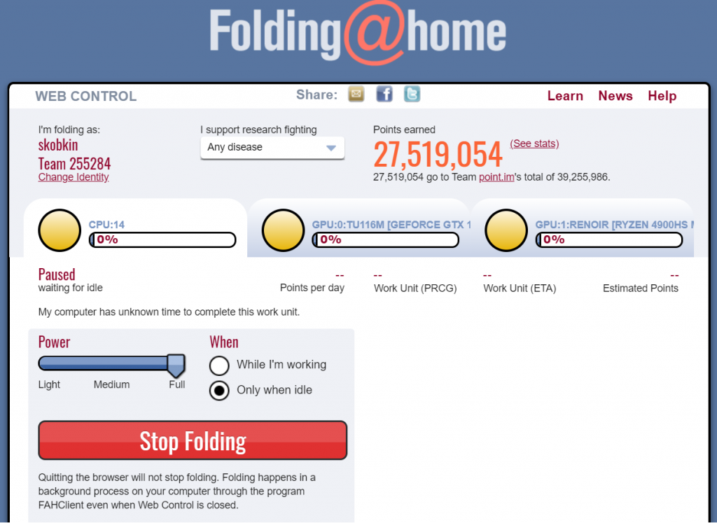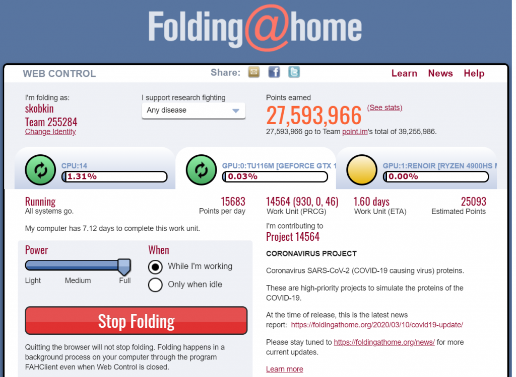 Попробуйте разные варианты и выберите тот, который подходит вам лучше всего - не мешает работать и не вызывает перегрева компьютера. Мощные компьютеры могут работать в режиме Full и вы практически не будете замечать, что Folding@HOME производит вычисления. На таких конфигурациях вычисления могут помешать разве что тяжёлым задачам типа видеомонтажа, систем проектирования, сборки ПО или работе игр.- Power - это усреднённая степень нагрузки на ваш ПК. Можно выбрать три уровня нагрузки: